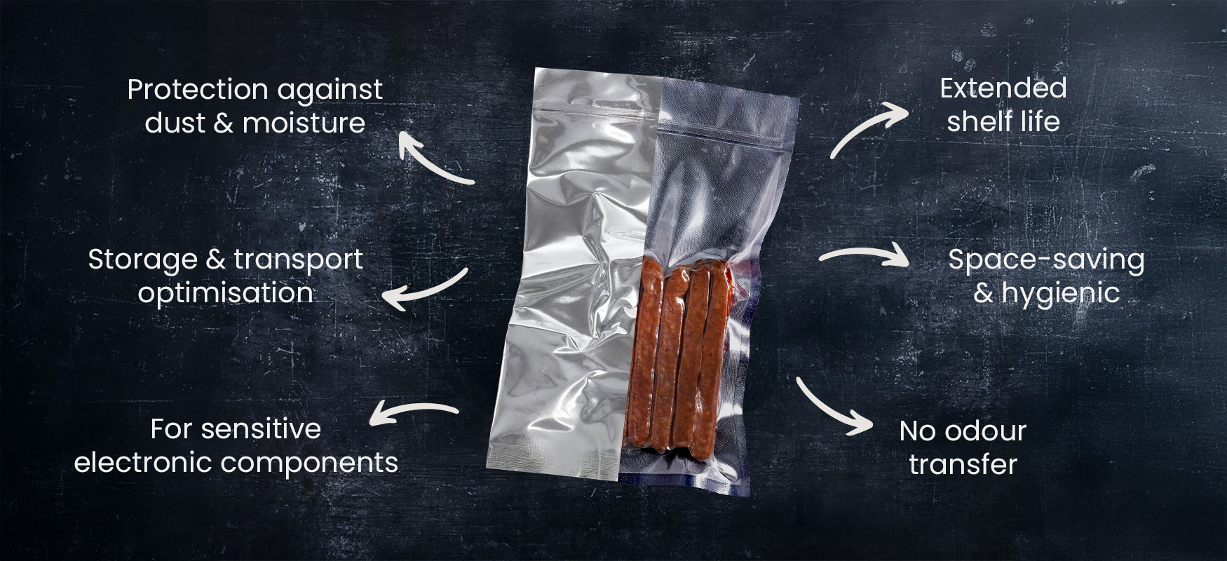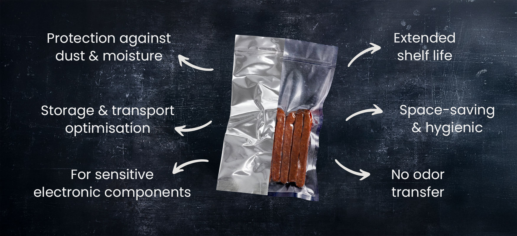 There is good reason why vacuuming is one of the most popular methods for extending the shelf life of food. Vacuum packing not only keeps food fresh for much longer, but also provides perfect protection against freezer burn when freezing. Not only food items but also industrial components can be vacuum-sealed, for example, to be protected from external influences. This form of packing is also extremely space saving. Since vacuum bags come into direct contact with your products, sometimes for years, it is vital to pay attention to the quality of the vacuum foils. At Lava, we offer you a large selection of different vacuum bags in different sizes, individually tailored to your specific needs.